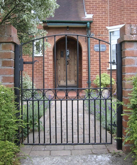 Stylish small pedestrian gate with a curved top and decorative circular detail, perfect for enhancing entrances with a touch of character.